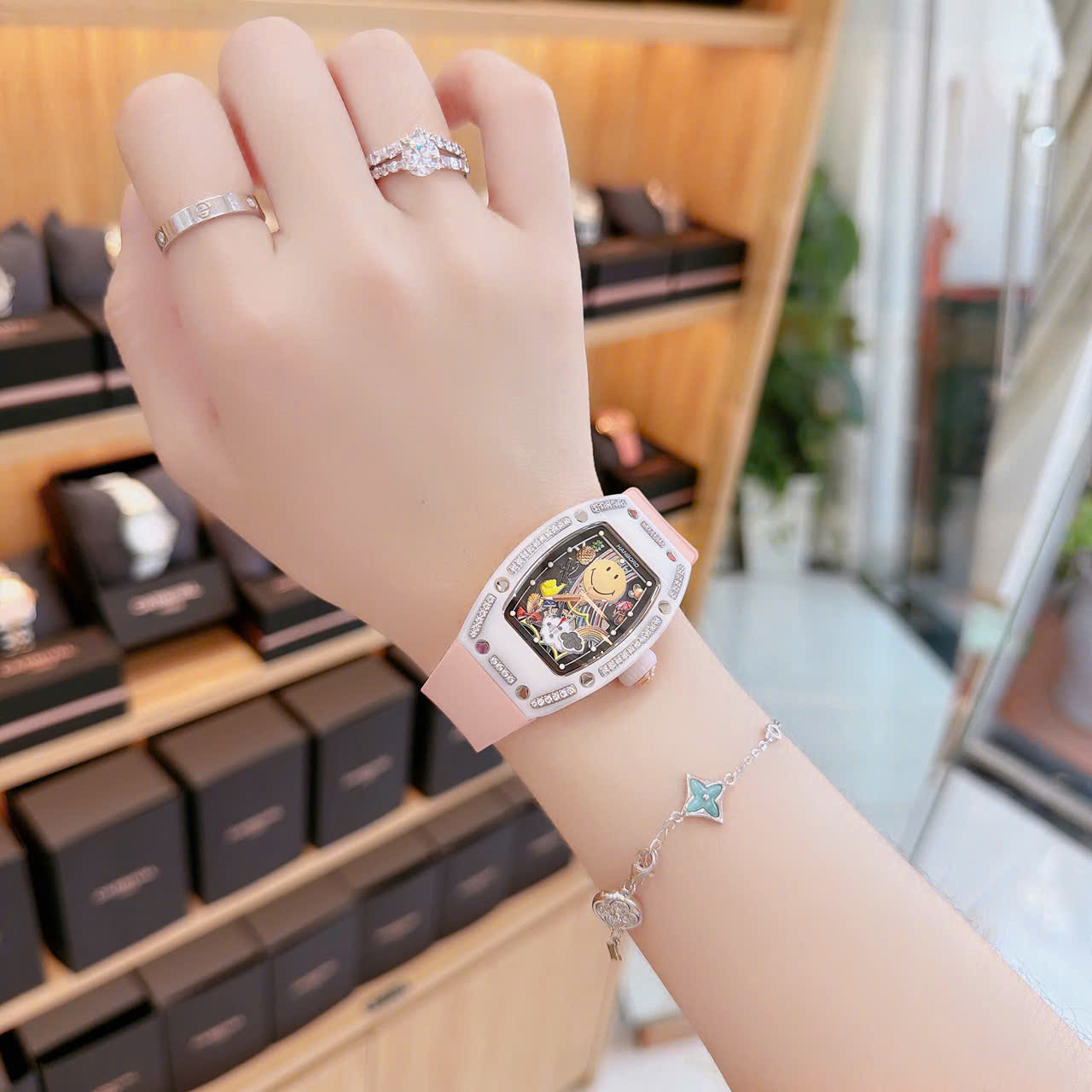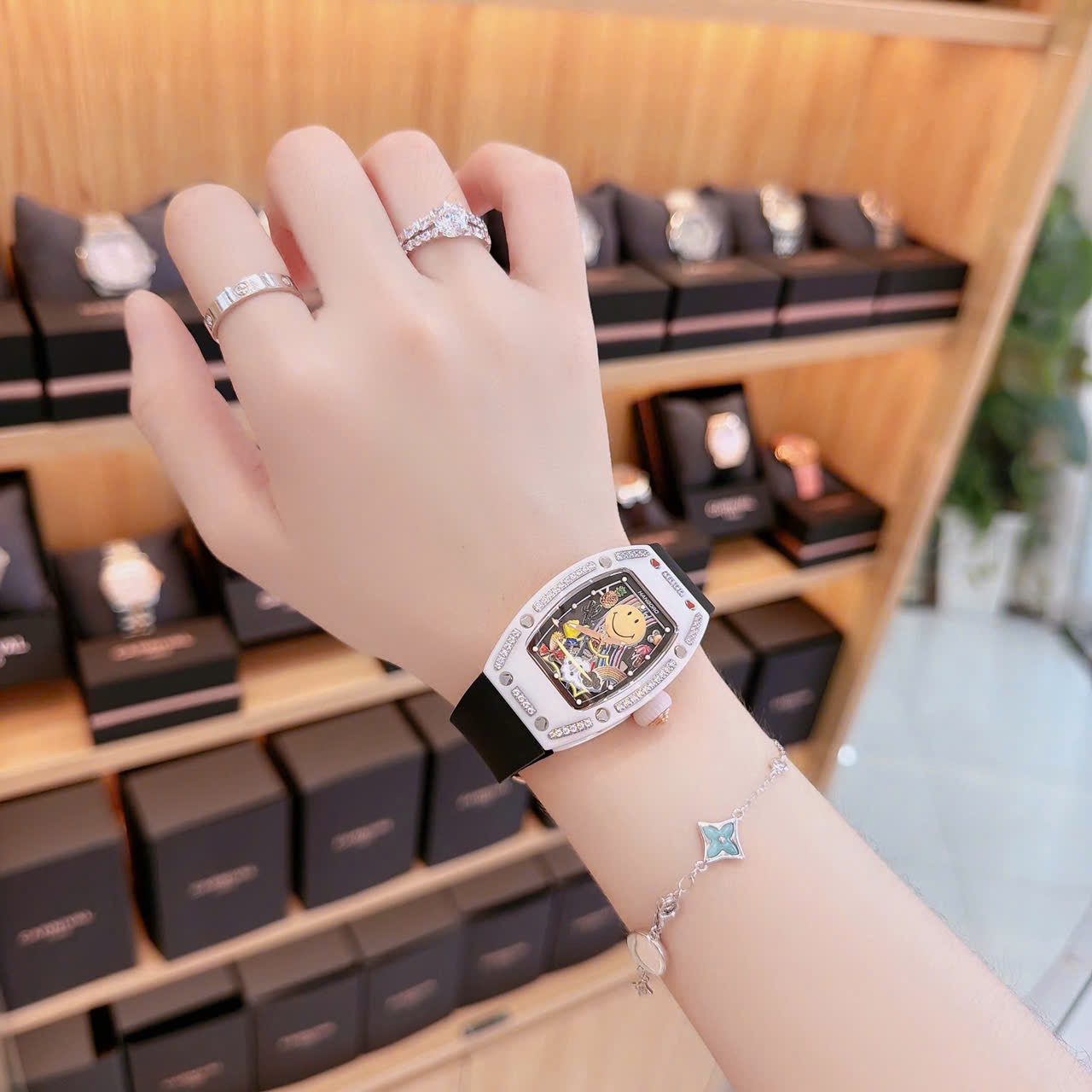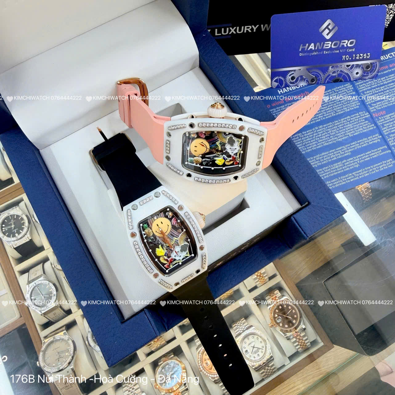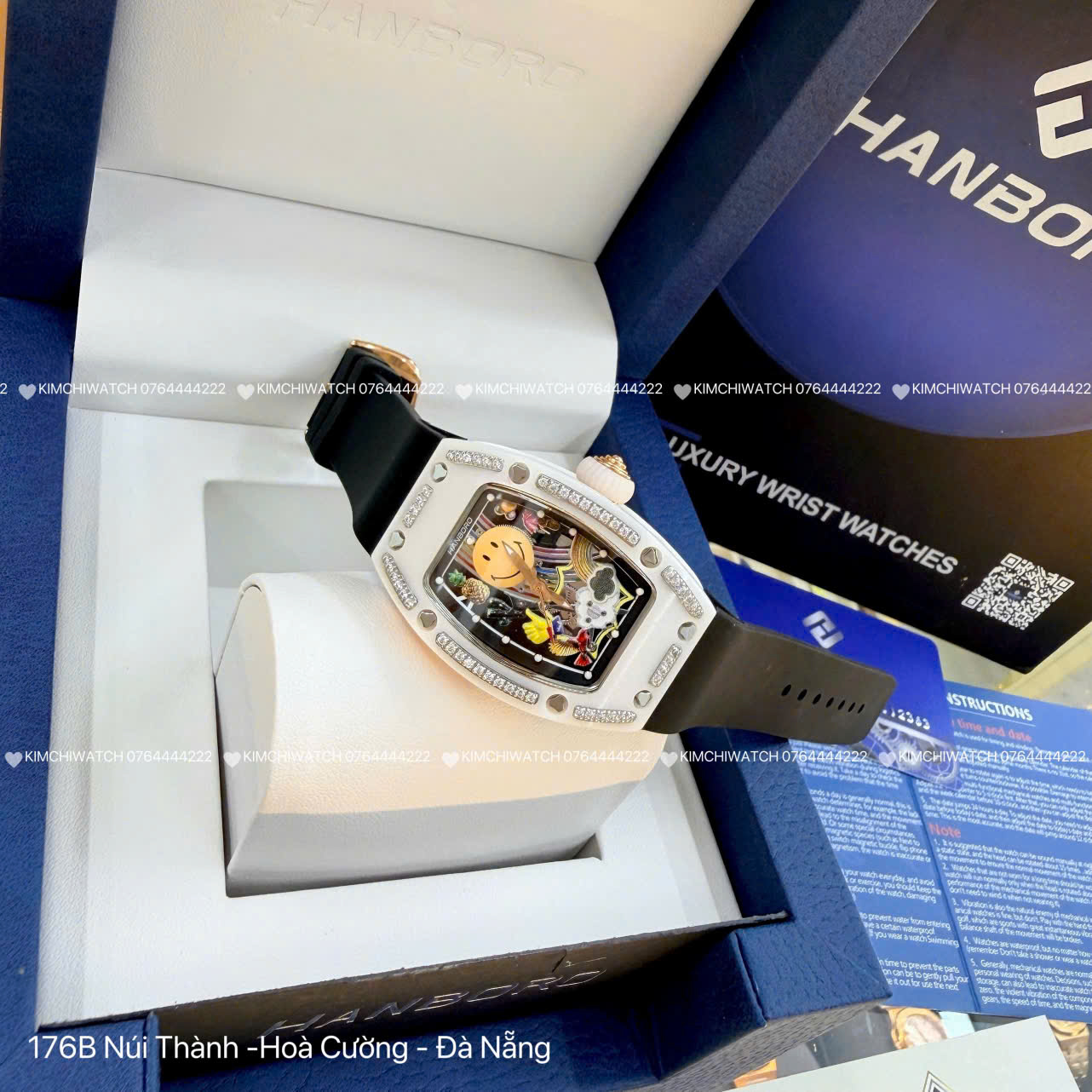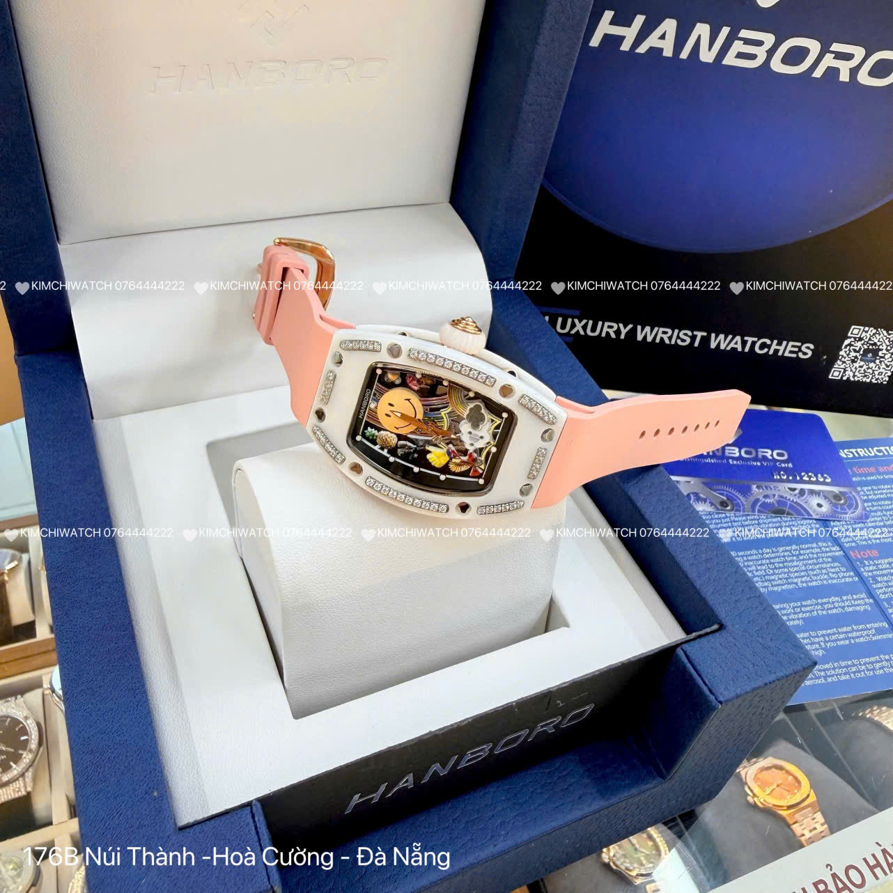 Đồng hồ Hanboro mặt cườisize 36 mm vỏ bằng thép không gỉ , đính đá swarovski cao cấp, Kính khoáng cứng , chống nước 3atm, dây su bọc da cao cấp. Máy Pin Nhật bền bỉ . Tuổi thọ pin lên đến 3 năm . Đồng hồ Hanboro lên tay rất sang chảnh, thu hút mọi ánh nhìn, giúp bạn luôn tự tin , xinh đẹp và tràn đầy năng lượng . Tặng fullbox : hộp gỗ bọc da cao cấp, túi giấy hãng, sổ thẻ , túi giấy của shop , thẻ bảo hành, voucher giảm giá... Đổi trả lên đến 30 ngày , lỗi đổi mới không cần chờ đợi. Bảo hành lên đến 2 năm giúp quý khách yên tâm sử dụng .