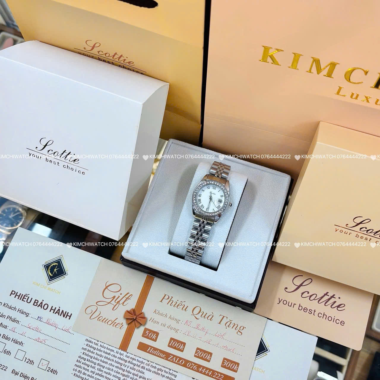 Đồng hồ Scottie 30mm vỏ bằng thép không gỉ , Kính khoáng chống xước, chống nước 3atm, dây kim loại cao cấp . Máy Pin bền bỉ . Tuổi thọ pin lên đến 3 năm . Đồng hồ Scottie lên tay rất sang chảnh, thu hút mọi ánh nhìn, giúp bạn luôn tự tin , xinh đẹp và tràn đầy năng lượng . Tặng fullbox : hộp gỗ bọc da cao cấp, túi giấy hãng, sổ thẻ , túi giấy của shop , thẻ bảo hành, voucher giảm giá... Đổi trả lên đến 30 ngày , lỗi đổi mới không cần chờ đợi. Bảo hành lên đến 2 năm giúp quý khách yên tâm sử dụng .