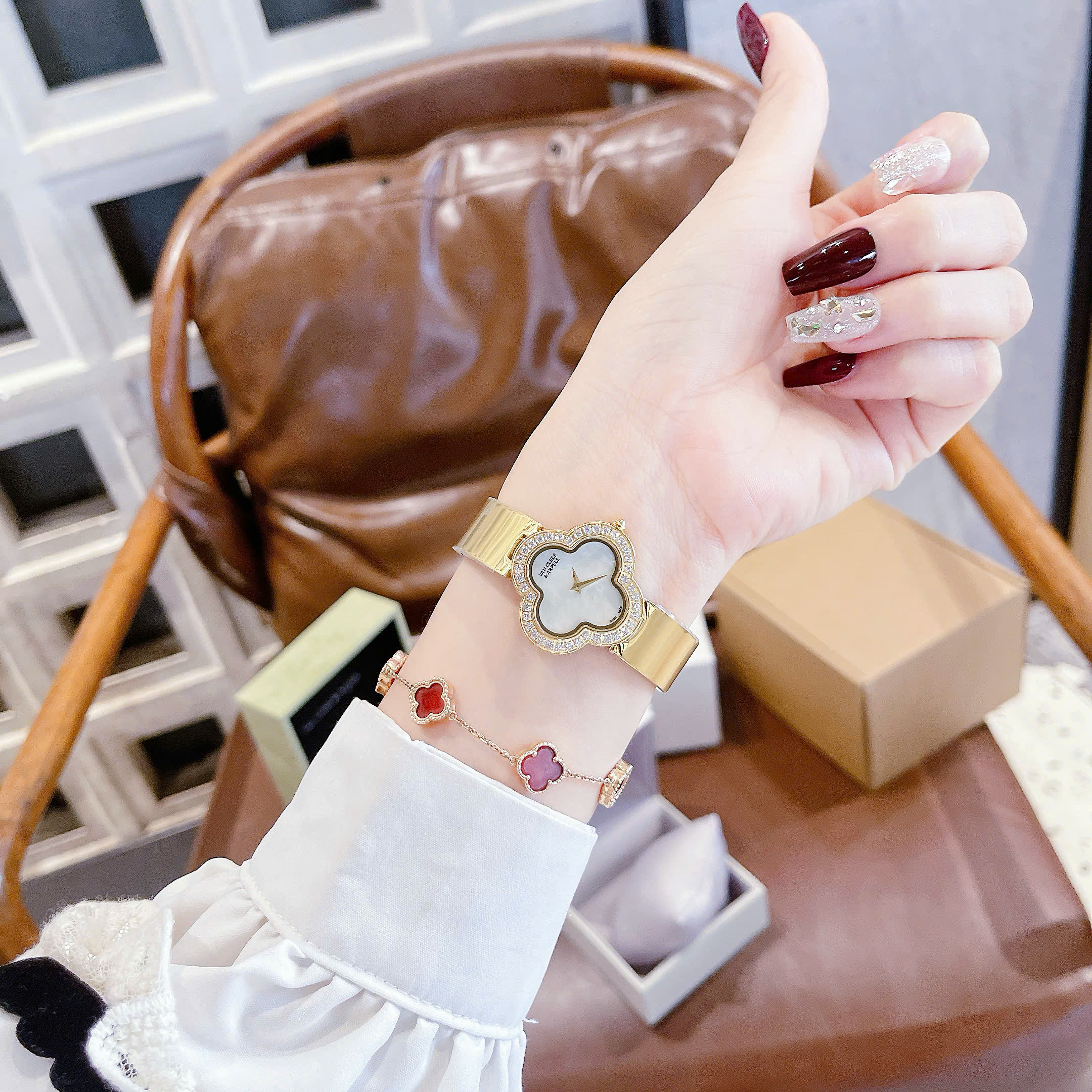 Đồng hồ VAN CLEEF & ARPELS BÔNG HOA 28mm vỏ bằng thép không gỉ , Kính khoáng, chống nước 3atm, dây kim loại cao cấp. Máy Pin Nhật bền bỉ . Tuổi thọ pin lên đến 3 năm . Đồng hồ VAN CLEEF & ARPELS BÔNG HOA lên tay rất sang chảnh, thu hút mọi ánh nhìn, giúp bạn luôn tự tin , xinh đẹp và tràn đầy năng lượng . Tặng fullbox : hộp gỗ bọc da cao cấp, túi giấy hãng, sổ thẻ , túi giấy của shop , thẻ bảo hành, voucher giảm giá... Đổi trả lên đến 30 ngày , lỗi đổi mới không cần chờ đợi. Bảo hành lên đến 2 năm giúp quý khách yên tâm sử dụng .