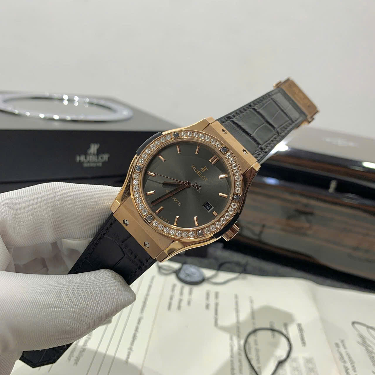 Đồng Hồ Hublot Classic Viền đính đá - Nam - Máy Thụy Sĩ - Size 40mm, Kính Khoáng Cứng, Chống Nước 3ATM, Dây da .